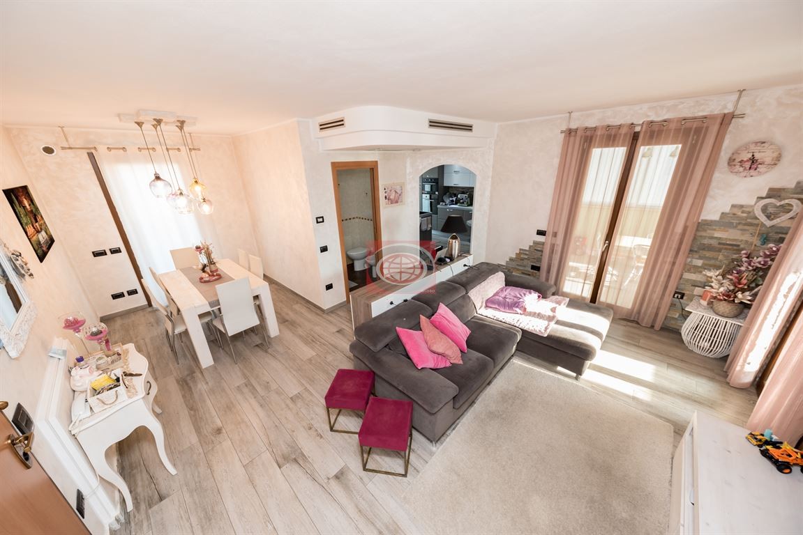 L'immobile si sviluppa su due livelli e si compone come segue: Piano principale: Ingresso su un luminoso soggiorno con zona pranzo dedicata, che si affaccia su una loggia verandata di 24 mq, ideale per godere di un ampio spazio extra nella zona living. La cucina è abitabile e ben separata dal soggiorno, creando un ambiente accogliente e funzionale. Completa il piano un bagno di servizio. Piano sottotetto: Accedendo tramite una comoda scala, si arriva alla mansarda che ospita 2 camere da letto matrimoniali e una camera singola attualmente adibita a studio. Inoltre, è presente un secondo bagno, dotato di tutti i comfort. L'appartamento è dotato di riscaldamento a pavimento, aria condizionata e un moderno impianto di domotica che garantisce un elevato livello di comfort e sicurezza. Completano la proprietà un garage al piano seminterrato e una cantina di 10 mq, utili per risolvere ogni esigenza di spazio. La posizione dell'immobile è ideale per chi cerca una soluzione residenziale ben collegata, ma lontana dal traffico, in una zona tranquilla e vicina a scuole, supermercati e mezzi pubblici. Per maggiori informazioni o per fissare una visita, non esitate a contattarci! N.B.: le presenti informazioni non costituiscono elemento contrattuale.