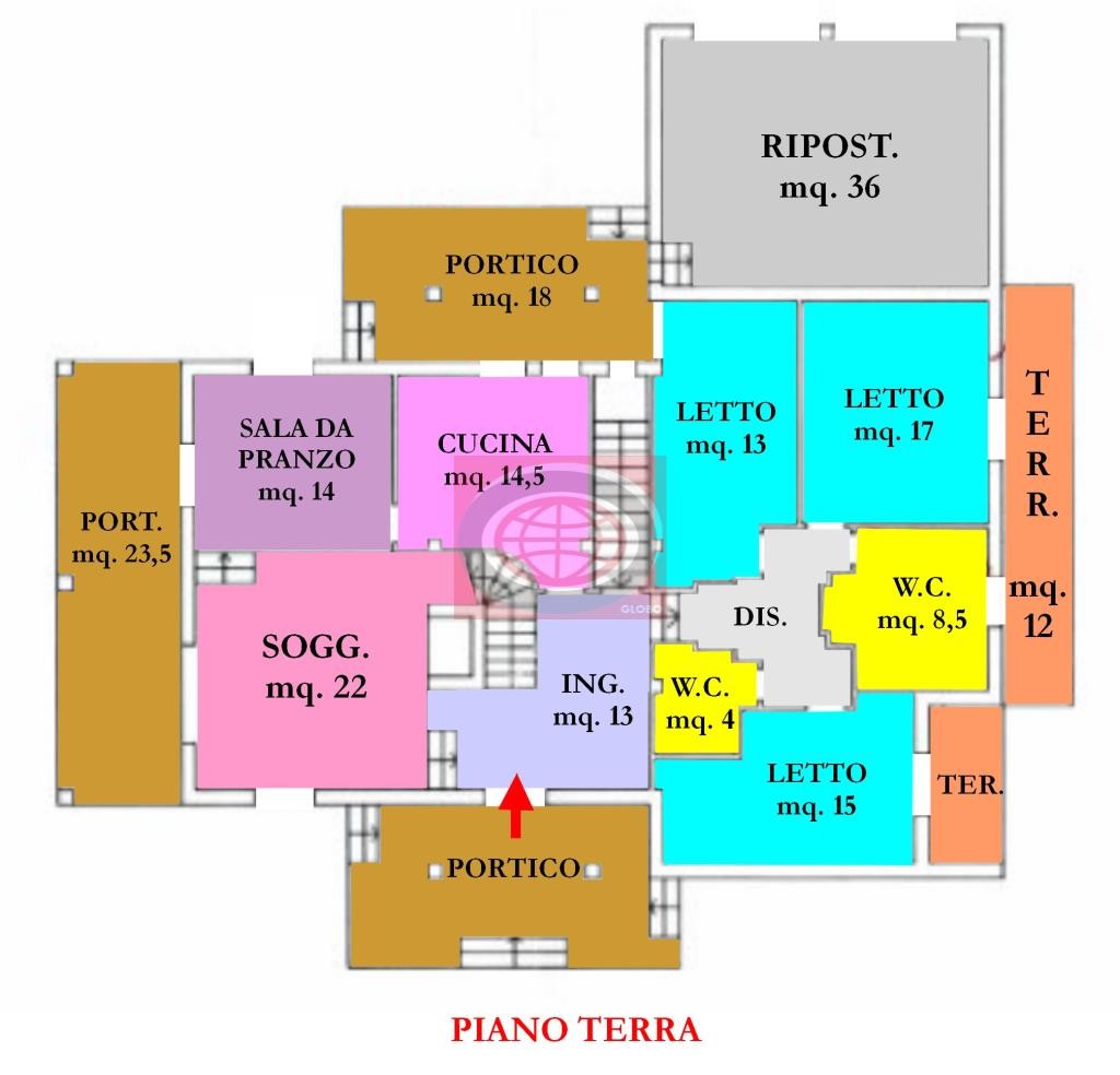 La proprietà presenta una zona giorno costituita da porticati, ingresso, grande e luminoso salone con camino, cucina abitabile , sala pranzo.