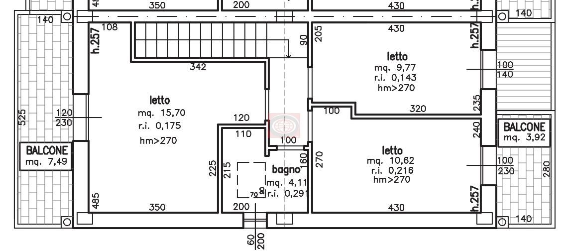 - PIANO PRIMO: disimpegno, 3 camere letto (mq 15,70 + 10,50 + 10), bagno e due balconi.