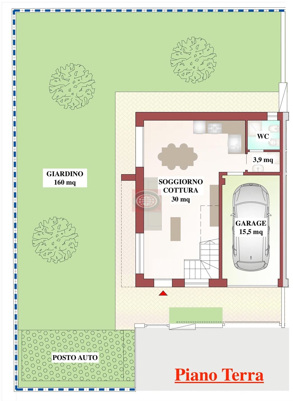 La villetta è disposta su due livelli così suddivisi:PIANO TERRA ingresso su soggiorno con angolo cottura (mq 29,50), antibagno-bagno, giardino privato di mq 160 garage e posto auto;PIANO PRIMO disimpegno, tre camere da letto, due bagni, due balconi.