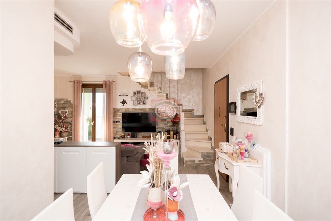 L'immobile si sviluppa su due livelli e si compone come segue: Piano principale: Ingresso su un luminoso soggiorno con zona pranzo dedicata, che si affaccia su una loggia verandata di 24 mq, ideale per godere di un ampio spazio extra nella zona living. La cucina è abitabile e ben separata dal soggiorno, creando un ambiente accogliente e funzionale. Completa il piano un bagno di servizio. Piano sottotetto: Accedendo tramite una comoda scala, si arriva alla mansarda che ospita 2 camere da letto matrimoniali e una camera singola attualmente adibita a studio. Inoltre, è presente un secondo bagno, dotato di tutti i comfort. L'appartamento è dotato di riscaldamento a pavimento, aria condizionata e un moderno impianto di domotica che garantisce un elevato livello di comfort e sicurezza. Completano la proprietà un garage al piano seminterrato e una cantina di 10 mq, utili per risolvere ogni esigenza di spazio. La posizione dell'immobile è ideale per chi cerca una soluzione residenziale ben collegata, ma lontana dal traffico, in una zona tranquilla e vicina a scuole, supermercati e mezzi pubblici. Per maggiori informazioni o per fissare una visita, non esitate a contattarci! N.B.: le presenti informazioni non costituiscono elemento contrattuale.