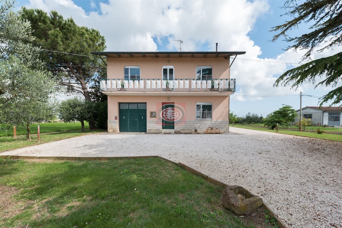 Cesena (CSC439), ubicata tra la Calabrina e Capannaguzzo, proponiamo casa singola in buone condizioni d'uso, disposta su due livelli così suddivisi: PIANO TERRA ampio ingresso, cucina-soggiorno-pranzo (mq 35,50), disimpegno, bagno, lavanderia, vano sottoscala, garage, ampio locale ad uso ripostiglio h-media 3.29 (mq 39) area pertinenziale di c.a 2500 mq; PIANO PRIMO, disimpegno (mq 15) quattro comode camere da letto (mq 18 + 17 + 17,50 + 11,40), bagno e balcone. La proprietà comprende anche 3 locali ad uso magazzino per un totale di 108,50 e 3,3 ettari di terreno agricolo irrigato e attualmente affittato. La casa necessita di qualche lavorino di ripristino ma è già abitabilissima nello stato attuale. Il prezzo comprende casa, magazzini e terreno agricolo, pozzo per l'irrigazione. Ulteriori informazioni in ufficio. N.B. le presenti informazioni non costituiscono elemento contrattuale.