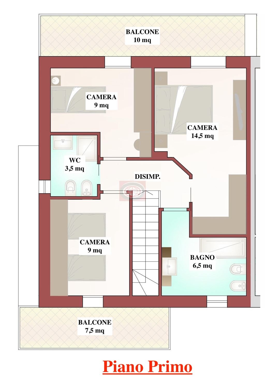 La villetta è disposta su due livelli così suddivisi:PIANO TERRA ingresso su soggiorno con angolo cottura (mq 29,50), antibagno-bagno, giardino privato di mq 160 garage e posto auto;PIANO PRIMO disimpegno, tre camere da letto, due bagni, due balconi.