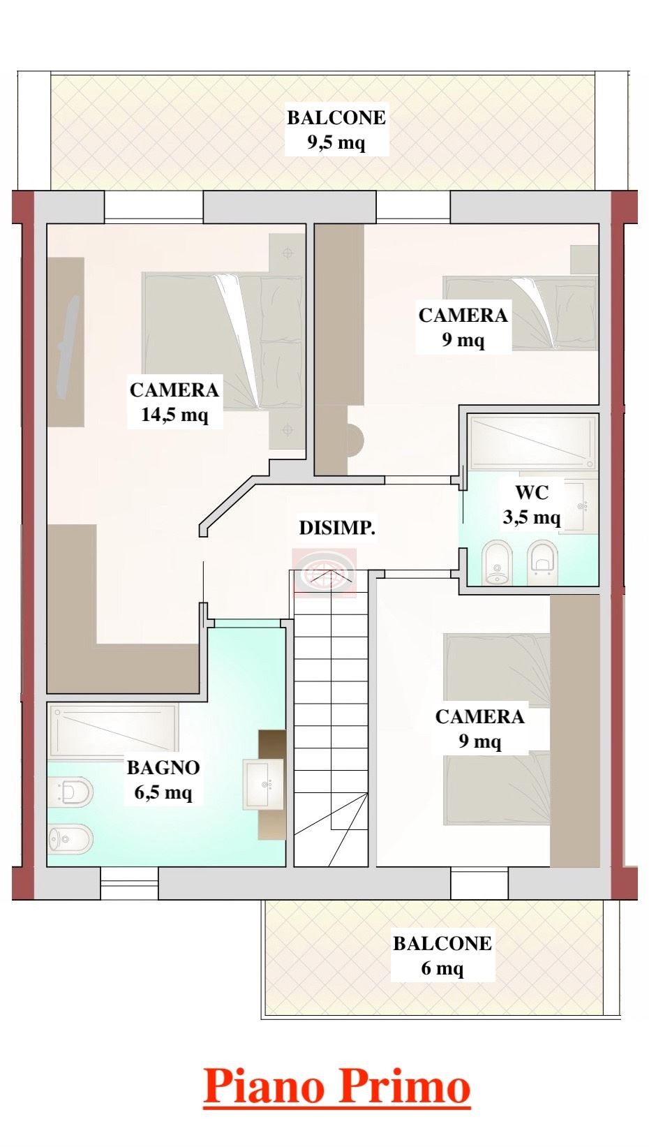 La villetta è disposta su due livelli così suddivisi:PIANO TERRA ingresso su soggiorno con angolo cottura (mq 29,50), antibagno-bagno, giardino privato di mq 50 garage e posto auto; PIANO PRIMO disimpegno, tre camere da letto, due bagni, due balconi.