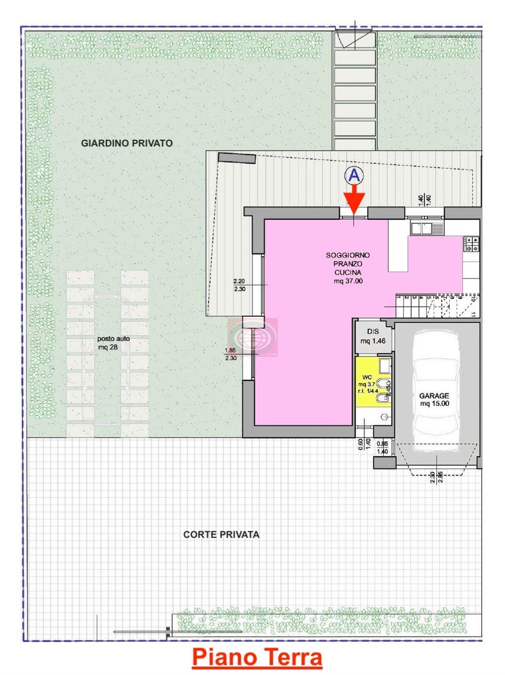 PIANO TERRA - ingresso su  zona giorno open-space di 37 mq  con zona cottura a vista con affaccio sul giardino privato di oltre 200 mq con area per posti auto, bagno e garage;